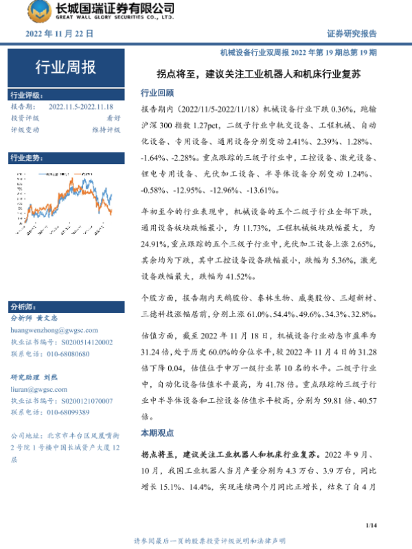【长城国瑞证券】【20221122】机械设备行业双周报2022年第19期总第19期:拐点将至,建议关注工业机器人和机床行业复苏-14页