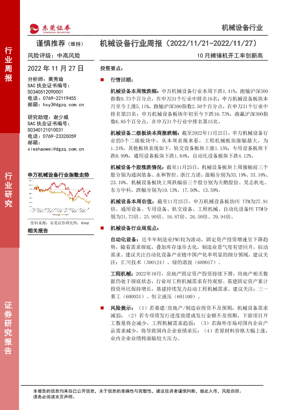 【东莞证券】【20221127】机械设备行业周报:10月摊铺机开工率创新高-13页