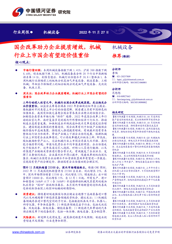 【银河证券】【20221127】20221127-中国银河-机械设备行业周报:国企改革助力企业提质增效,机械行业上市国企有望迎价值重估-19页