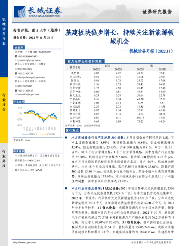 【长城证券】【20221130】20221130-长城证券-机械设备月报:基建板块稳步增长,持续关注新能源领域机会-19页