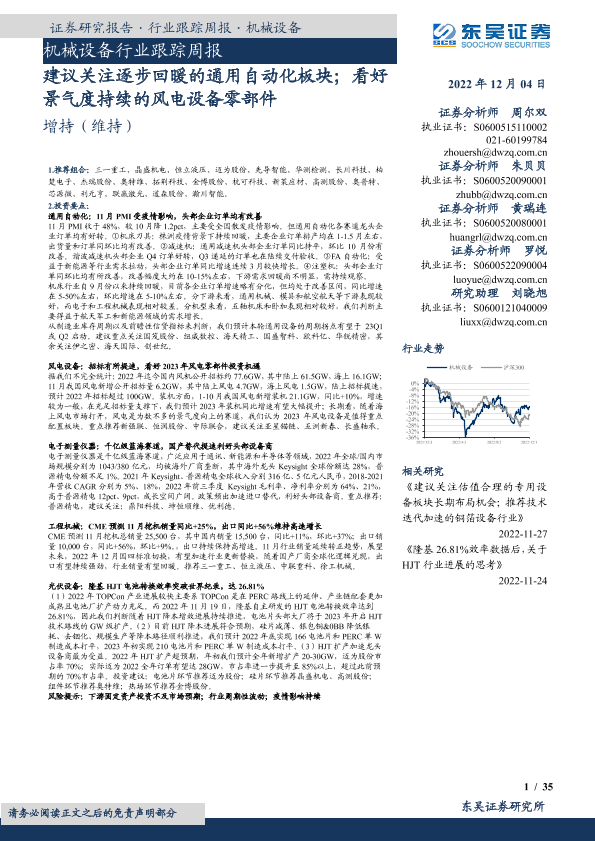 【东吴证券】【20221204】20221204-东吴证券-机械设备行业跟踪周报:建议关注逐步回暖的通用自动化板块;看好景气度持续的风电设备零部件-35页
