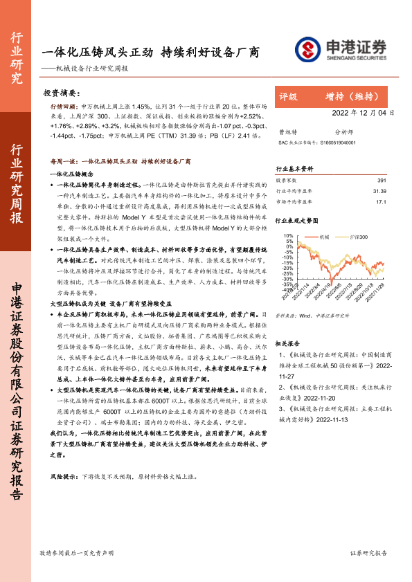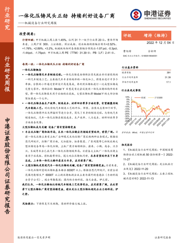 【申港证券】【20221204】20221204-申港证券-机械设备行业研究周报:一体化压铸风头正劲 持续利好设备厂商-11页