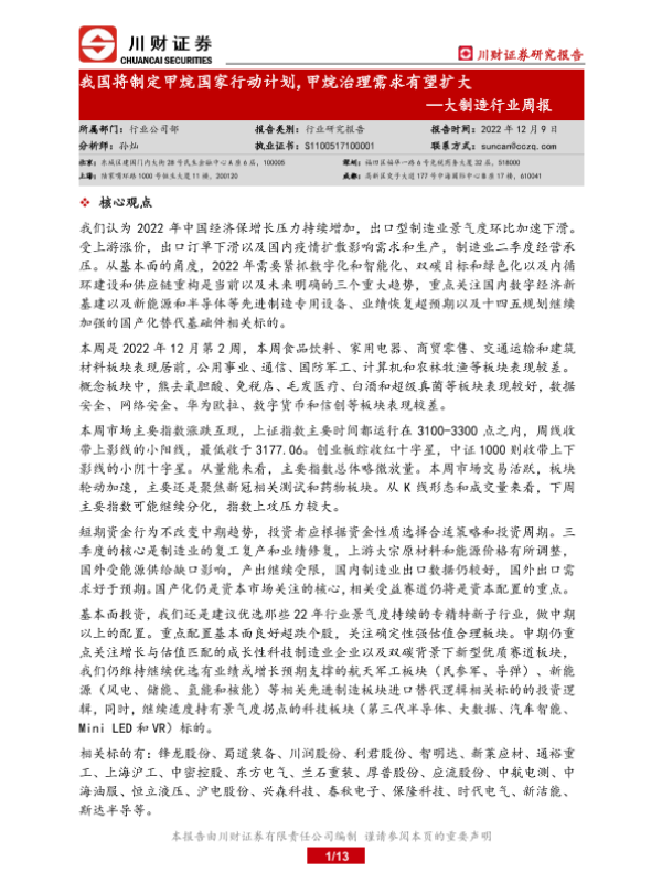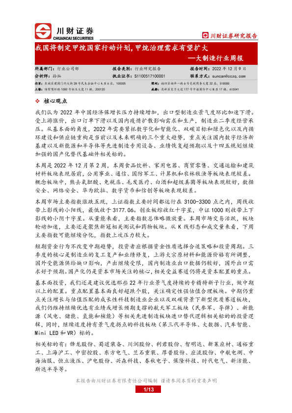 【川财证券】【20221209】20221209-川财证券-大制造行业周报:我国将制定甲烷国家行动计划,甲烷治理需求有望扩大-13页