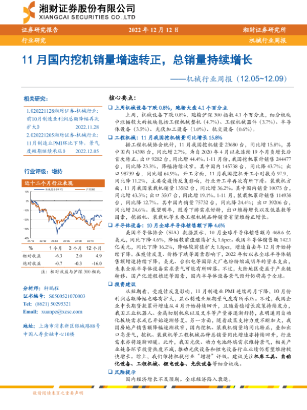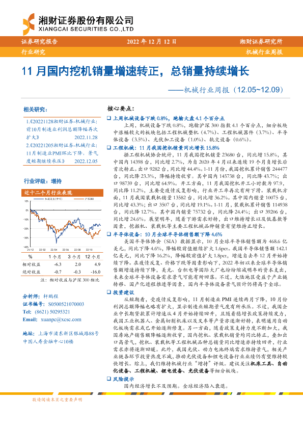 【湘财证券】【20221212】20221212-湘财证券-机械行业周报:11月国内挖机销量增速转正,总销量持续增长-12页