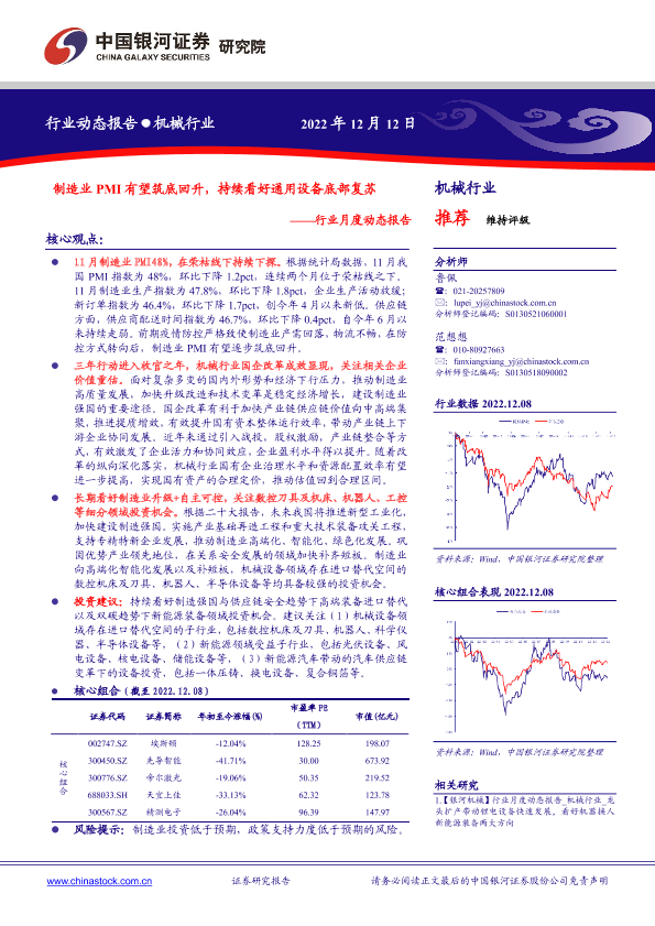【银河证券】【20221212】20221212-中国银河-机械行业月度动态报告:制造业PMI有望筑底回升,持续看好通用设备底部复苏-30页
