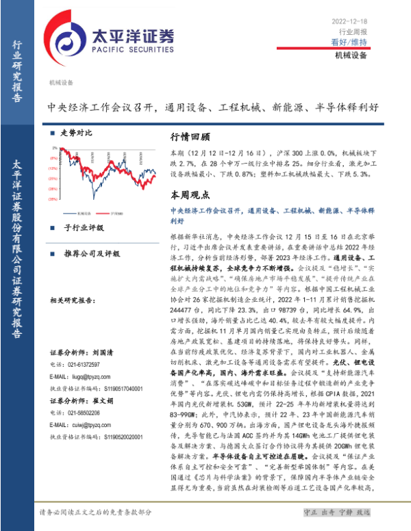 【太平洋证券】【20221218】20221218-太平洋-机械设备行业周报:中央经济工作会议召开,通用设备、工程机械、新能源、半导体释利好-12页