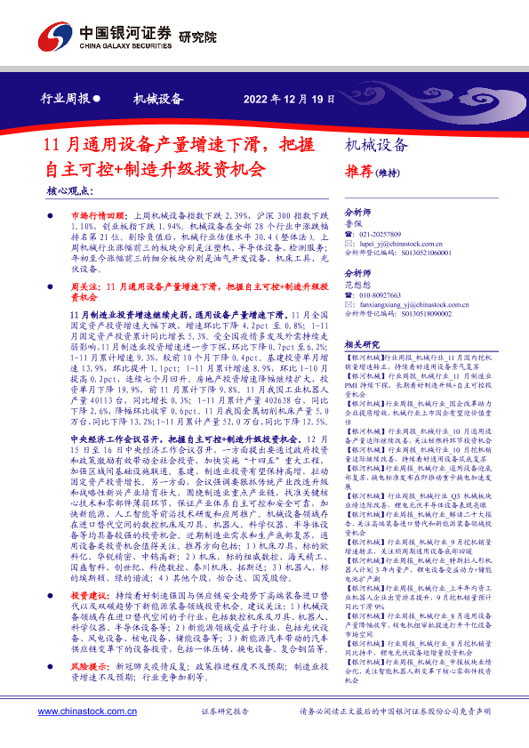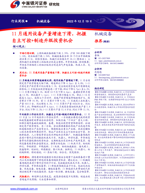 【银河证券】【20221219】20221219-中国银河-机械设备行业周报:11月通用设备产量增速下滑,把握自主可控+制造升级投资机会-21页