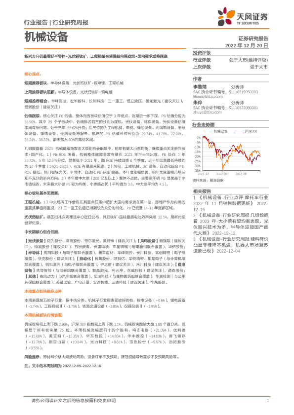 【天风证券】【20221220】20221220-天风证券-机械设备行业研究周报:新兴方向仍最看好半导体+光伏钙钛矿,工程机械有望受益内需政策+国内需求或将探底-13页