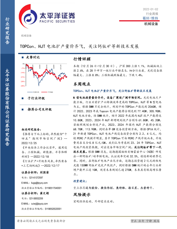 【太平洋证券】【20230102】20230102-太平洋-机械设备行业周报:TOPCon、HJT电池扩产量价齐飞,关注钙钛矿等新技术发展-10页