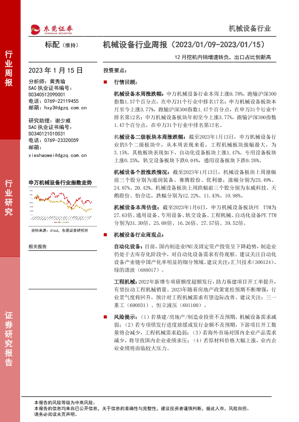 【东莞证券】【20230115】20230115-东莞证券-机械设备行业周报:12月挖机内销增速转负,出口占比创新高-12页