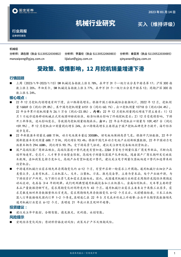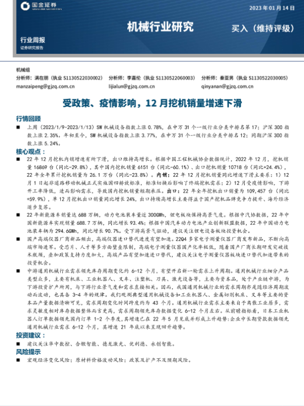 【国金证券】【20230114】20230114-国金证券-机械行业研究:受政策、疫情影响,12月挖机销量增速下滑-16页