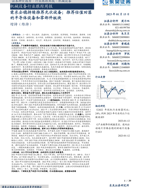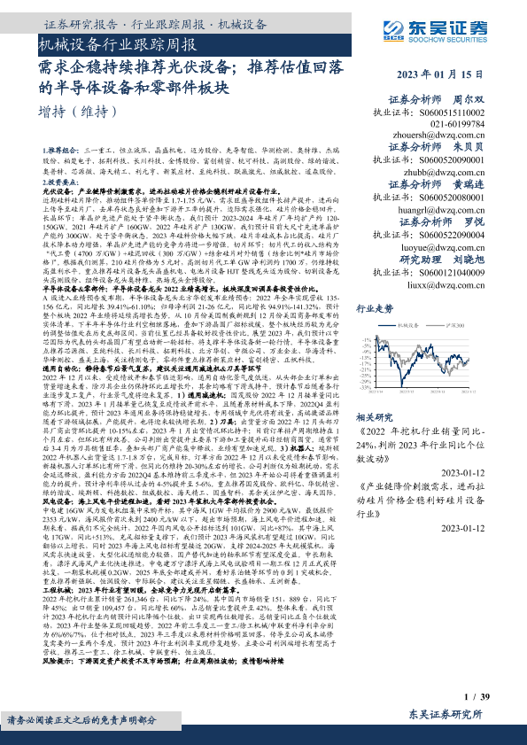 【东吴证券】【20230115】20230115-东吴证券-机械设备行业跟踪周报:需求企稳持续推荐光伏设备;推荐估值回落的半导体设备和零部件板块-39页