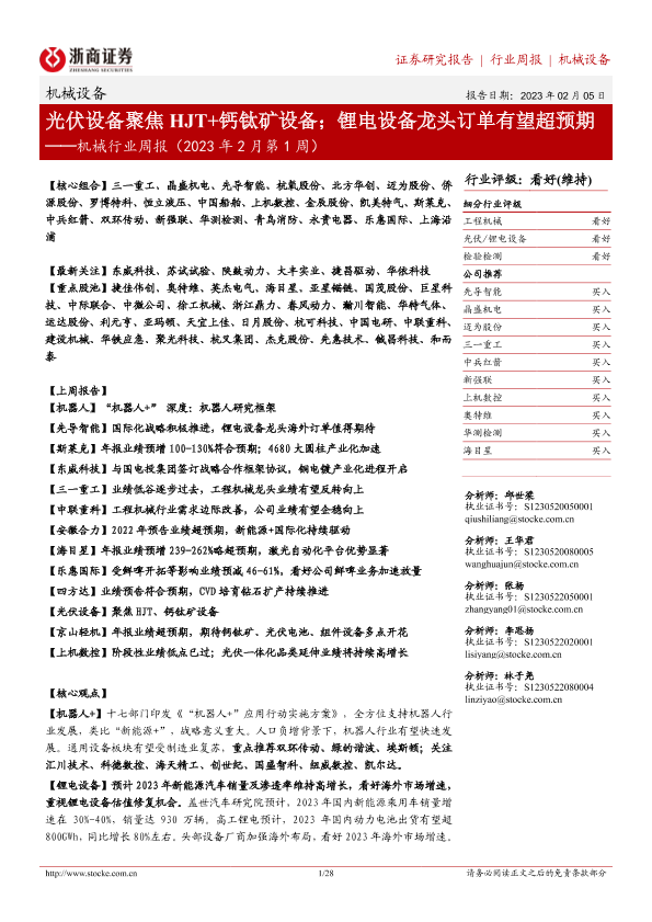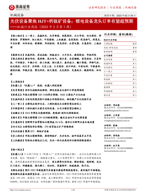【浙商证券】【20230205】机械行业周报(2023年2月第1周):光伏设备聚焦HJT+钙钛矿设备;锂电设备龙头订单有望超预期-28页