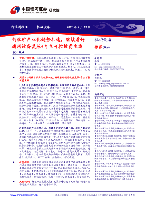 【银河证券】【20230213】20230213-中国银河-机械设备行业周报:钙钛矿产业化趋势加速,继续看好通用设备复苏+自主可控投资主线-21页