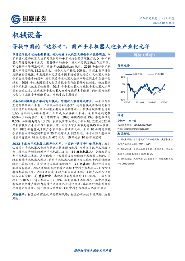 【国盛证券】【20230216】20230216-国盛证券-机械设备行业深度:寻找中国的“达芬奇”,国产手术机器人迎来产业化元年-33页
