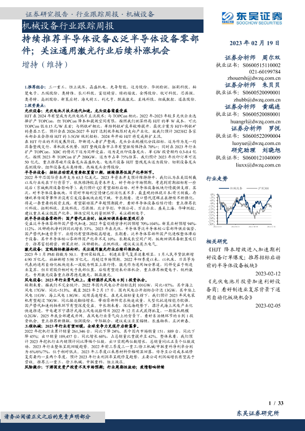 【东吴证券】【20230219】20230219-东吴证券-机械设备行业跟踪周报:持续推荐半导体设备&泛半导体设备零部件;关注通用激光行业后续补涨机会-33页