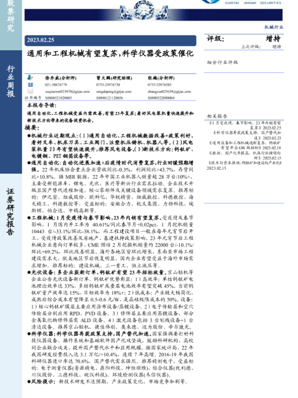 【国泰君安证券】【20230225】20230225-国泰君安-机械行业周报:通用和工程机械有望复苏,科学仪器受政策催化-34页