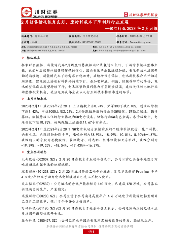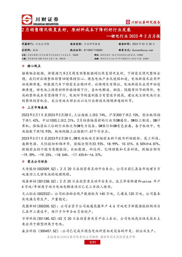 【川财证券】【20230228】锂电行业2023年2月月报:2月销售情况恢复良好,原材料成本下降利好行业发展-11页