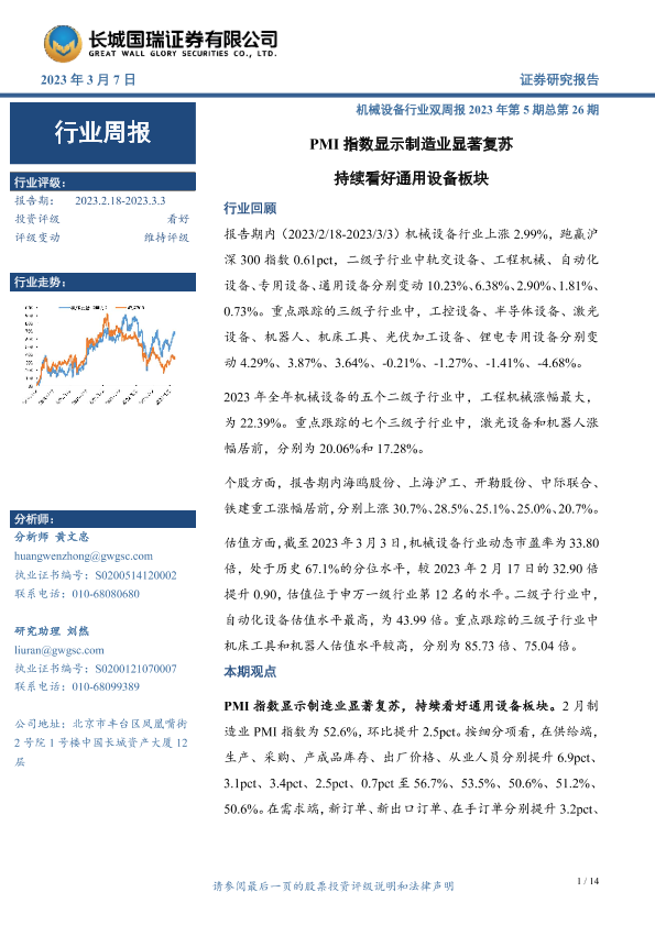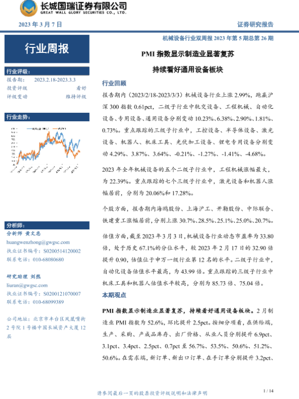 【长城国瑞证券】【20230307】20230307-长城国瑞证券-机械设备行业双周报2023年第5期总第26期:PMI指数显示制造业显著复苏 持续看好通用设备板块-14页