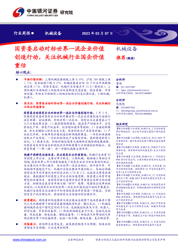 【银河证券】【20230307】20230307-中国银河-机械设备行业周报:国资委启动对标世界一流企业价值创造行动,关注机械行业国企价值重估-23页