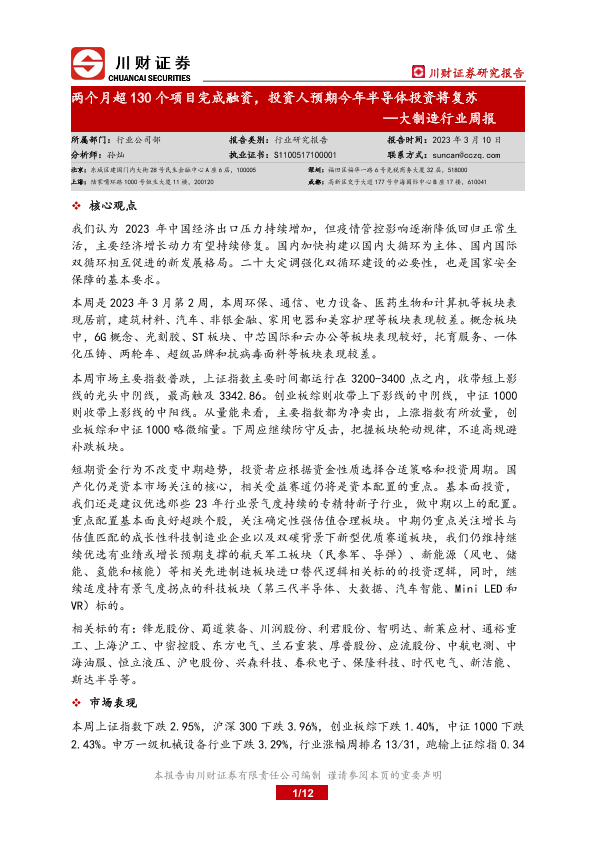 【川财证券】【20230310】20230310-川财证券-大制造行业周报:两个月超130个项目完成融资,投资人预期今年半导体投资将复苏-12页