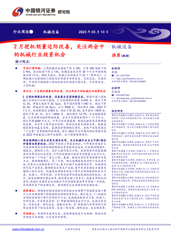 【银河证券】【20230313】20230313-中国银河-机械设备行业周报:2月挖机销量边际改善,关注两会中的机械行业投资机会-22页