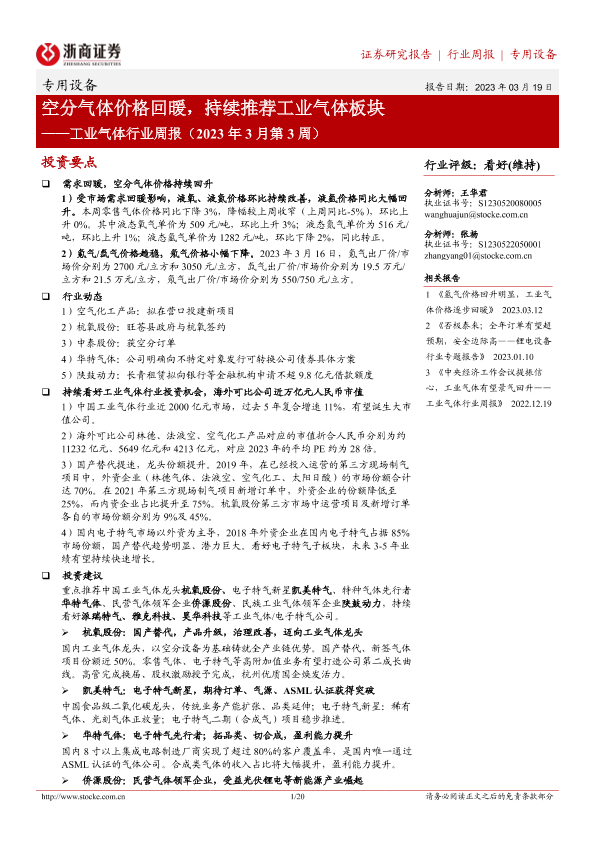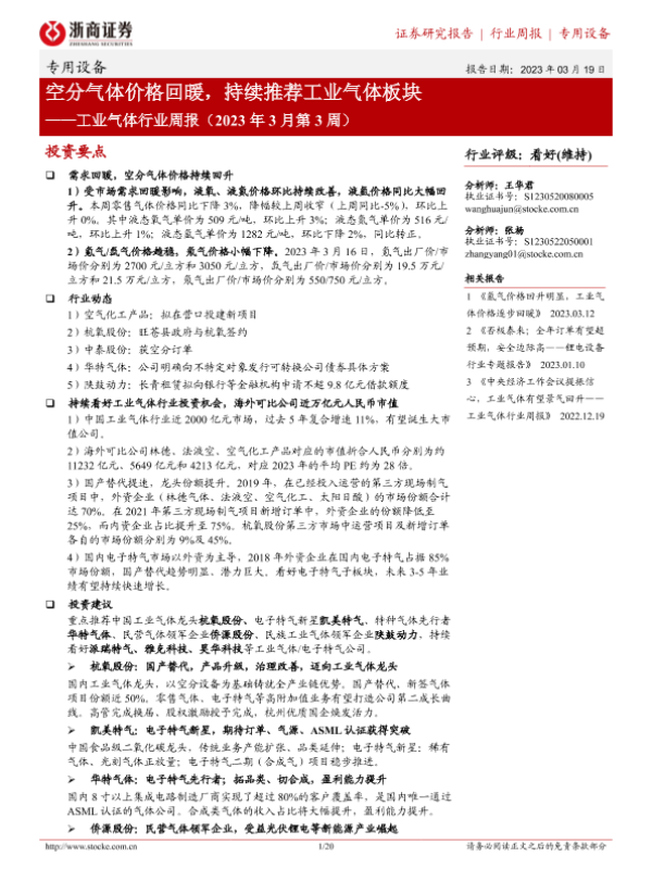 【浙商证券】【20230319】20230319-浙商证券-工业气体行业周报(2023年3月第3周):空分气体价格回暖,持续推荐工业气体板块-20页
