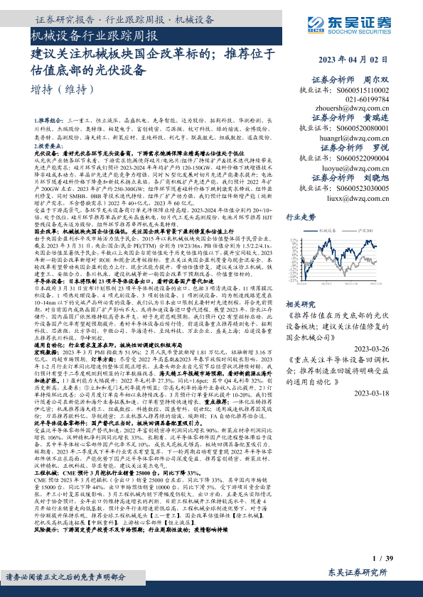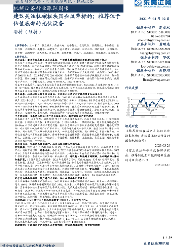 【东吴证券】【20230402】20230402-东吴证券-机械设备行业跟踪周报:建议关注机械板块国企改革标的;推荐位于估值底部的光伏设备-39页