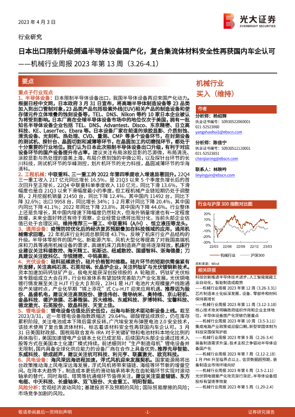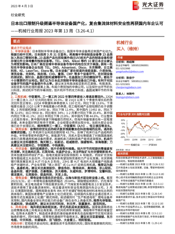 【光大证券】【20230403】机械行业周报2023年第13周:日本出口限制升级倒逼半导体设备国产化,复合集流体材料安全性再获国内车企认可-22页