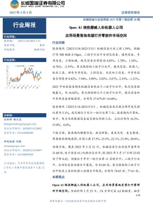 【长城国瑞证券】【20230404】20230404-长城国瑞证券-机械设备行业行业周报:Open AI领投挪威人形机器人公司应用场景落地有望打开零部件市场空间-15页