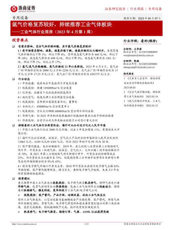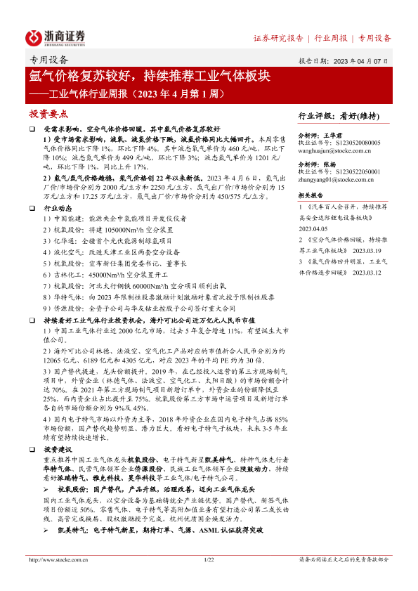 【浙商证券】【20230407】20230407-浙商证券-工业气体行业周报(2023年4月第1周):氩气价格复苏较好,持续推荐工业气体板块-22页