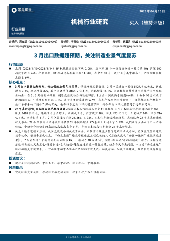 【国金证券】【20230415】20230415-国金证券-机械行业研究:3月出口数据超预期,关注制造业景气度复苏-15页