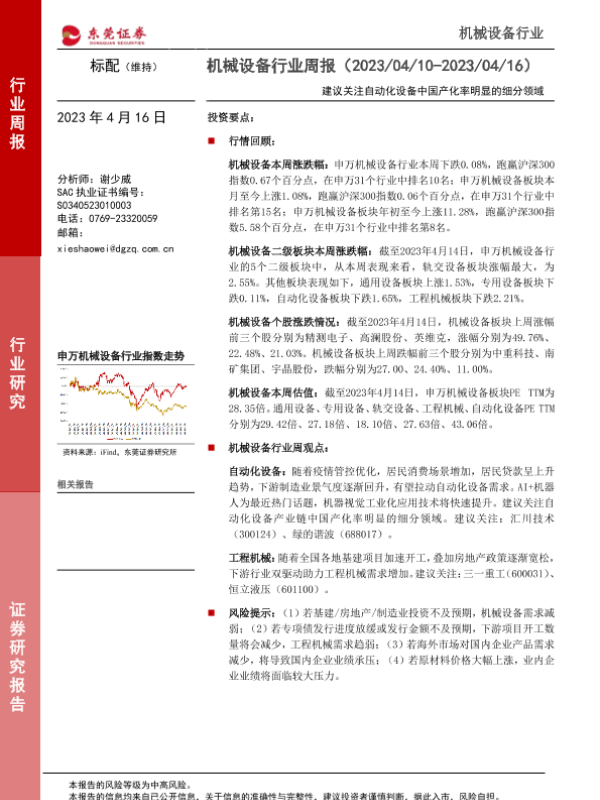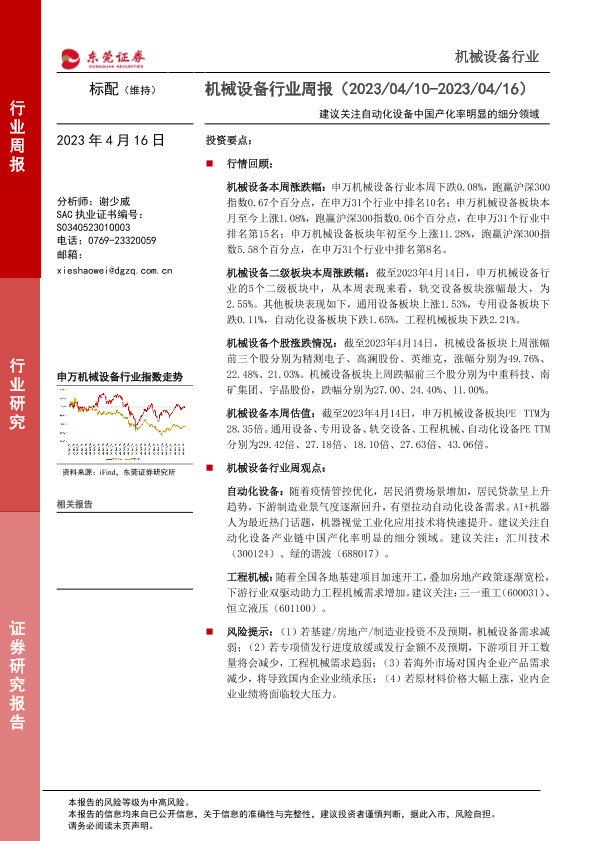 【东莞证券】【20230416】20230416-东莞证券-机械设备行业周报:建议关注自动化设备中国产化率明显的细分领域-11页