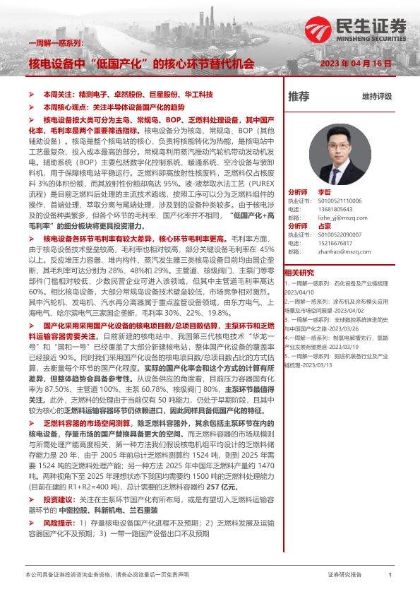 【民生证券】【20230416】机械一周解一惑系列:核电设备中“低国产化”的核心环节替代机会-21页