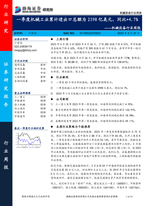 【渤海证券】【20230427】20230427-渤海证券-机械设备行业周报:一季度机械工业累计进出口总额为2598亿美元,同比+4.7%-10页