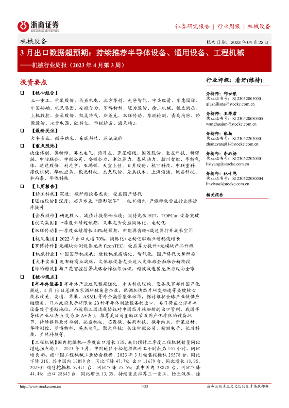【浙商证券】【20230422】机械行业周报(2023年4月第3周):3月出口数据超预期;持续推荐半导体设备、通用设备、工程机械-33页