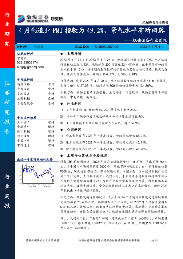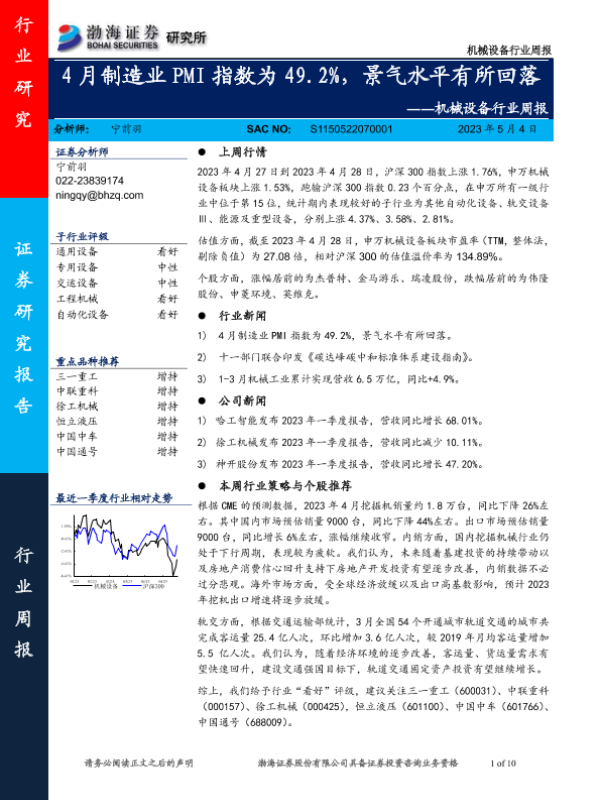 【渤海证券】【20230504】20230504-渤海证券-机械设备行业周报:4月制造业PMI指数为49.2%,景气水平有所回落-10页
