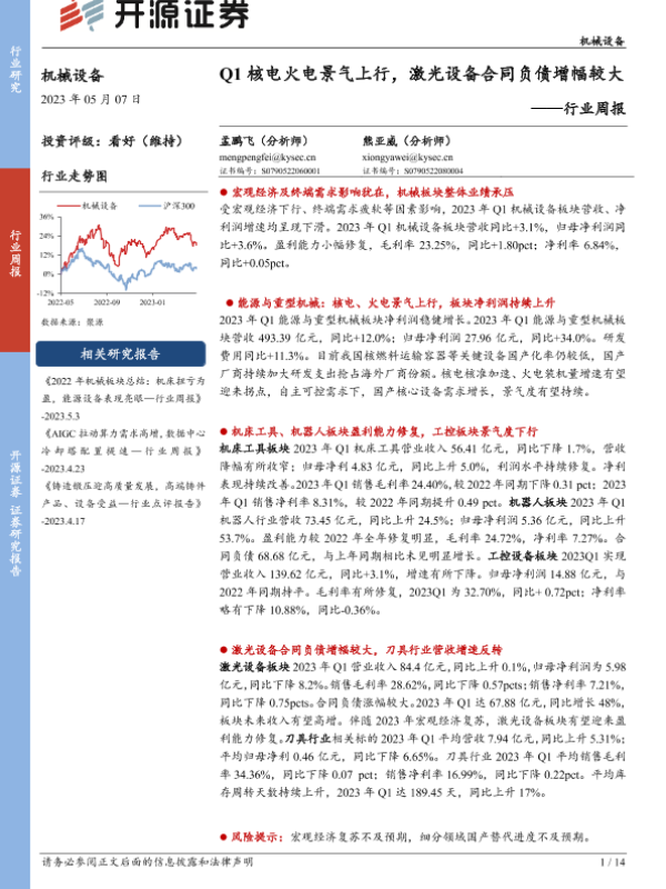 【开源证券】【20230507】20230507-开源证券-机械设备行业周报:Q1核电火电景气上行,激光设备合同负债增幅较大-14页