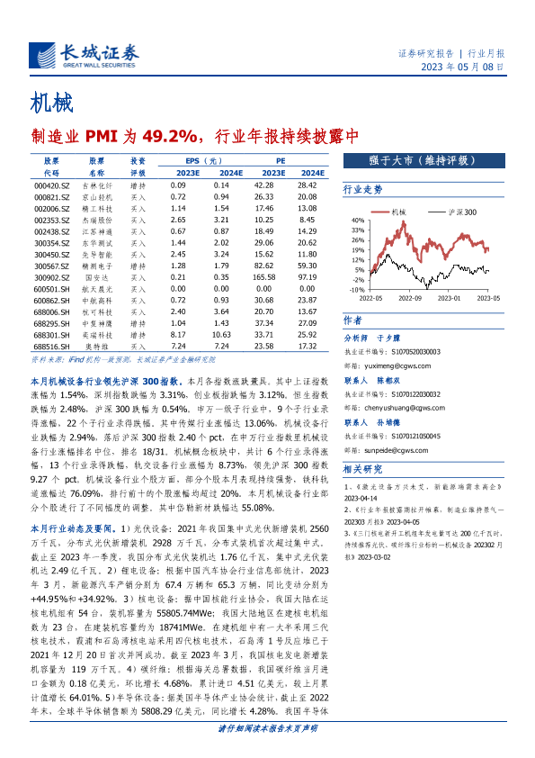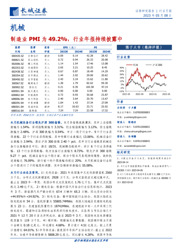 【长城证券】【20230508】20230508-长城证券-机械行业月报:制造业PMI为49.2%,行业年报持续披露中-18页