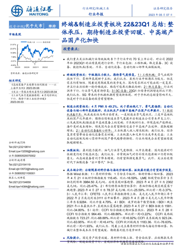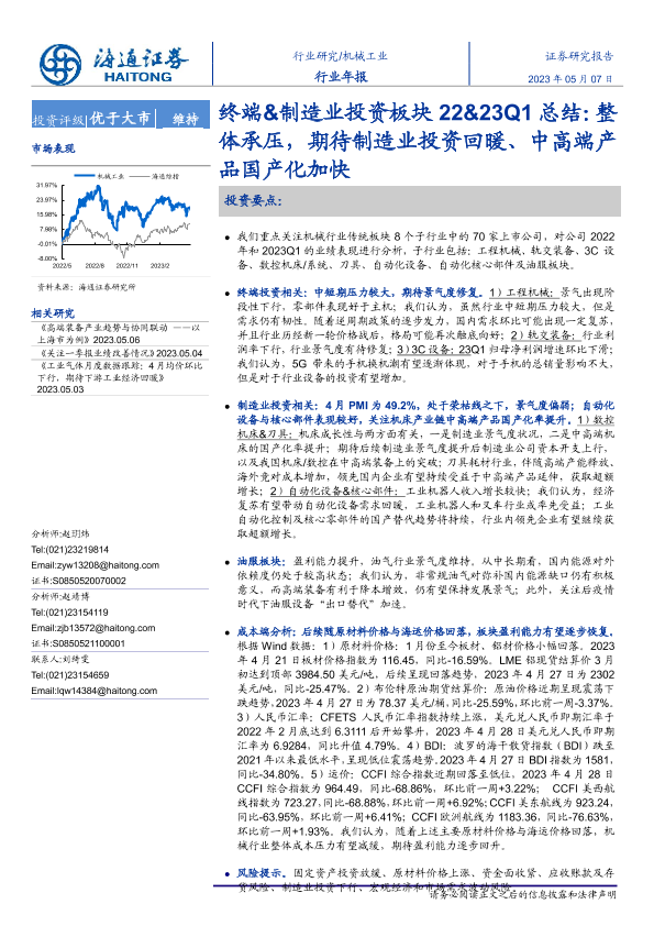 【海通证券】【20230507】20230507-海通证券-机械工业行业年报:终端&制造业投资板块22&23Q1总结:整体承压,期待制造业投资回暖、中高端产品国产化加快-31页