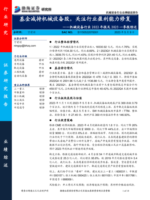 【渤海证券】【20230509】机械设备行业2022年报及2023一季报综述:基金减持机械设备股,关注行业盈利能力修复-18页