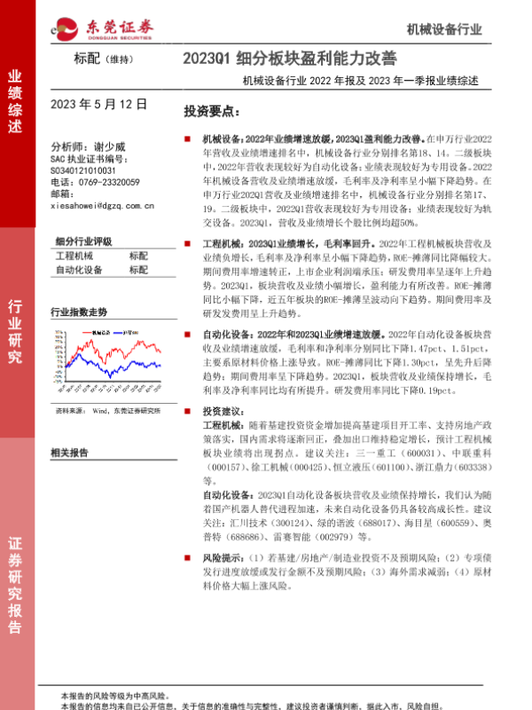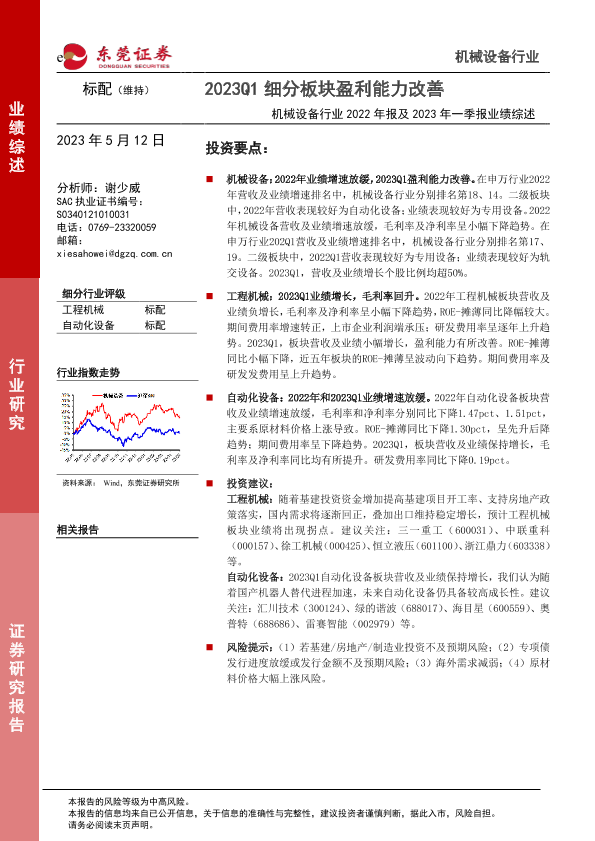 【东莞证券】【20230512】机械设备行业2022年报及2023年一季报业绩综述:2023Q1细分板块盈利能力改善-19页