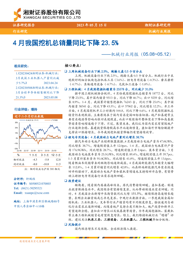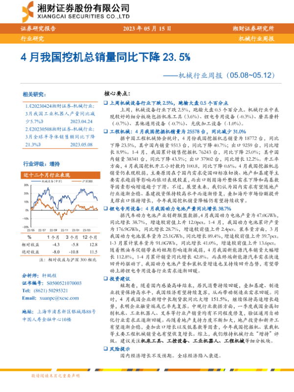 【湘财证券】【20230515】20230515-湘财证券-机械行业周报:4月我国挖机总销量同比下降23.5%-15页