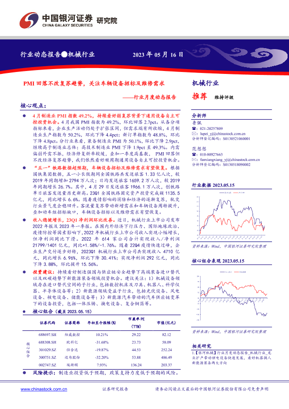 【银河证券】【20230516】20230516-中国银河-机械行业月度动态报告:PMI回落不改复苏趋势,关注车辆设备招标及维修需求-30页