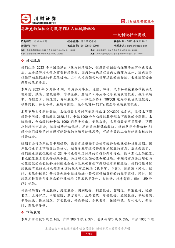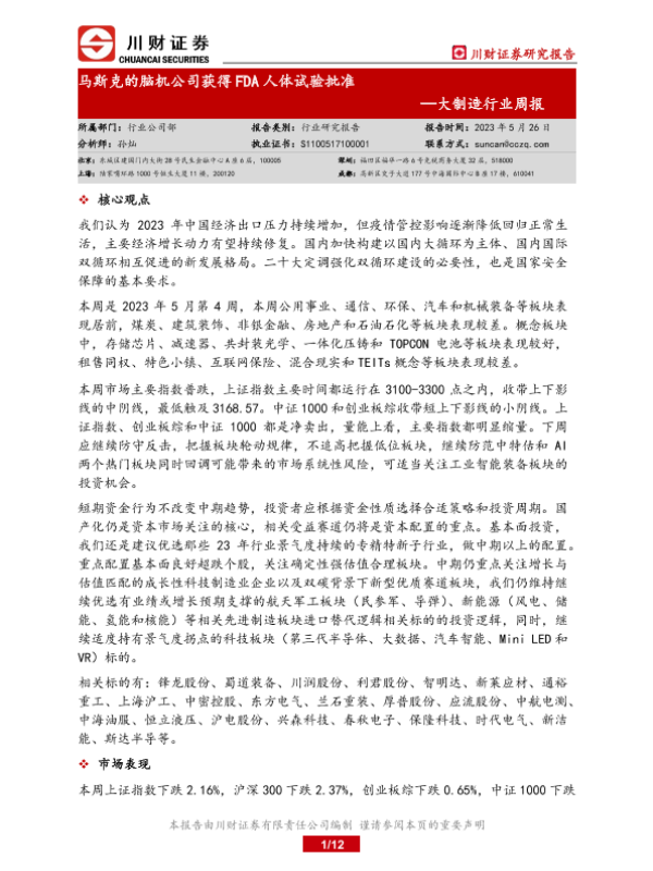 【川财证券】【20230526】20230526-川财证券-大制造行业周报:马斯克的脑机公司获得FDA人体试验批准-12页