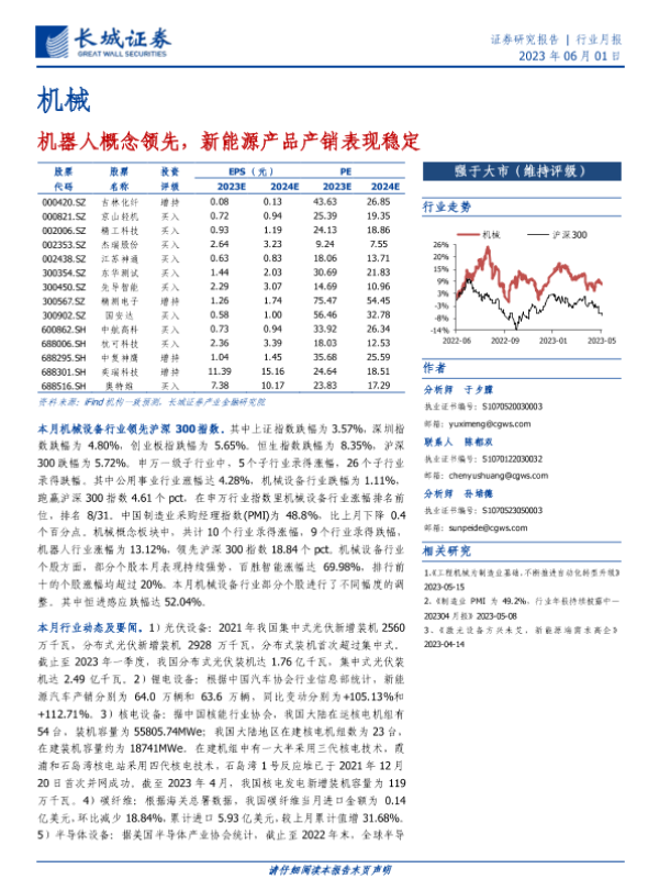 【长城证券】【20230601】20230601-长城证券-机械行业月报:机器人概念领先,新能源产品产销表现稳定-18页