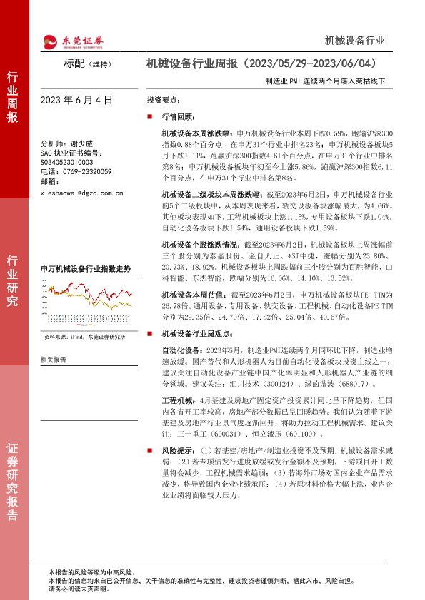 【东莞证券】【20230604】20230604-东莞证券-机械设备行业周报:制造业PMI连续两个月落入荣枯线下-11页