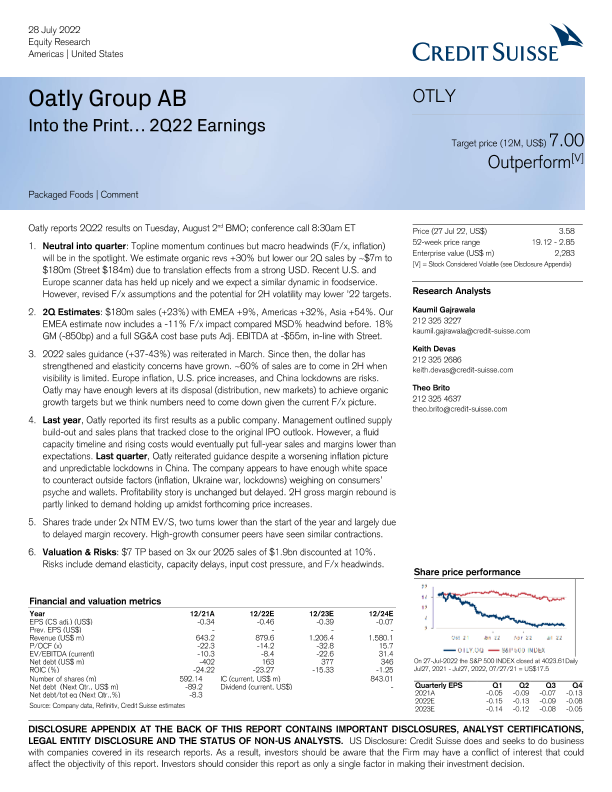 【Credit Suisse】【20220728】CS-Oatly Group AB 2Q22 财报预览-8页