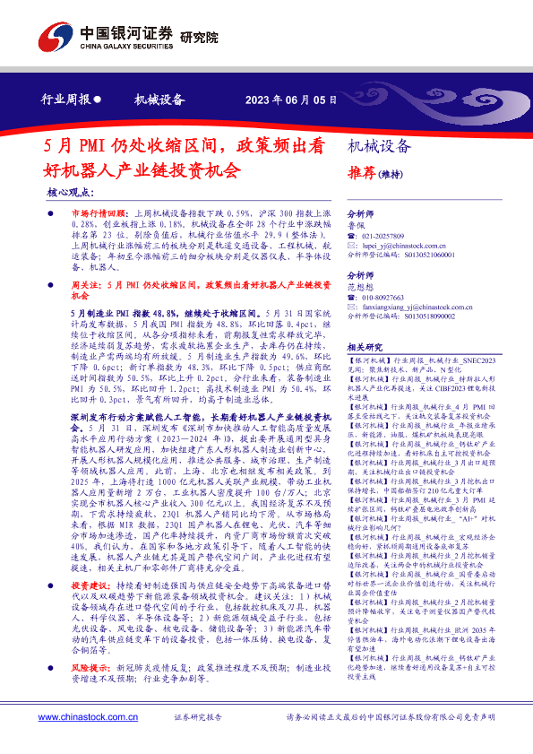 【银河证券】【20230605】20230605-中国银河-机械设备行业周报:5月PMI仍处收缩区间,政策频出看好机器人产业链投资机会-19页