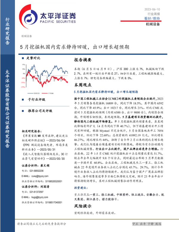 【太平洋证券】【20230610】5月挖掘机国内需求静待回暖,出口增长超预期-11页